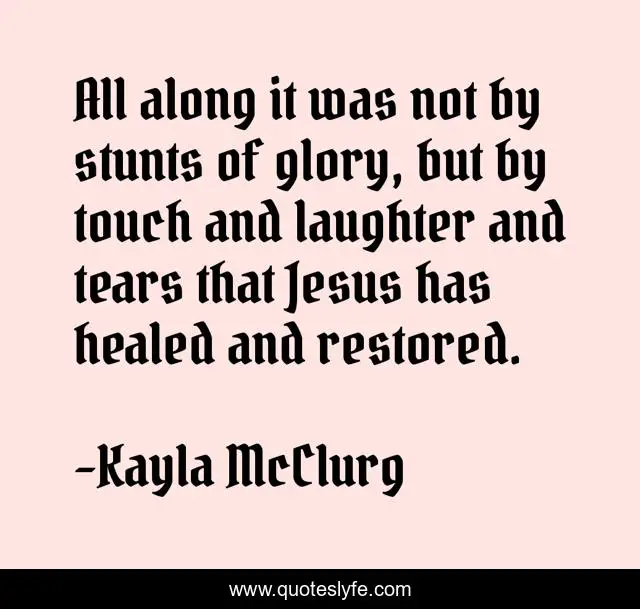 This page presents the quote "All along it was not by stunts of glory, but by touch and laughter and tears that Jesus has healed and restored.". Author of this quote is Kayla McClurg. This quote is about healing, glory, jesus,.