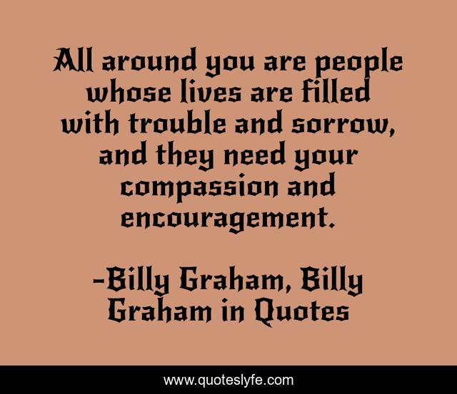 This page presents the quote "All around you are people whose lives are filled with trouble and sorrow, and they need your compassion and encouragement.". Author of this quote is Billy Graham, Billy Graham in Quotes. This quote is about encouragement, billy-graham,.