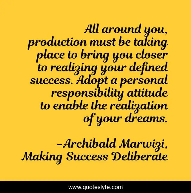 This page presents the quote "All around you, production must be taking place to bring you closer to realizing your defined success. Adopt a personal responsibility attitude to enable the realization of your dreams.". Author of this quote is Archibald Marwizi, Making Success Deliberate. This quote is about life, success, behaviour, attitude, legacy, growth, purpose, inspirational, leadership,.