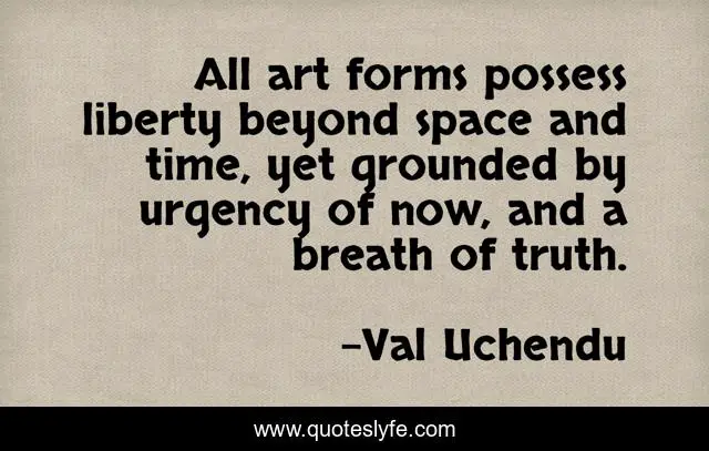 This page presents the quote "All art forms possess liberty beyond space and time, yet grounded by urgency of now, and a breath of truth.". Author of this quote is Val Uchendu. This quote is about artistry, artist, art, truth, time,.