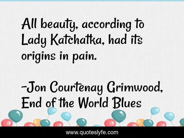 This page presents the quote "All beauty, according to Lady Katchatka, had its origins in pain.". Author of this quote is Jon Courtenay Grimwood, End of the World Blues. This quote is about pain, beauty,.