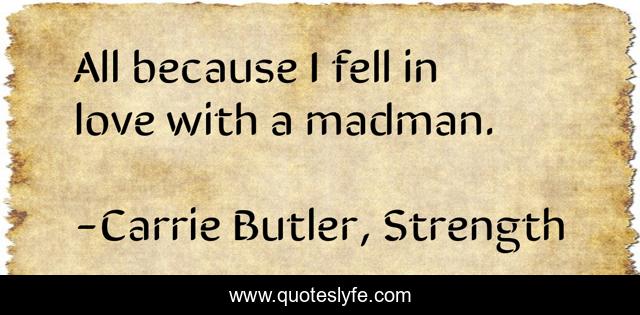 This page presents the quote "All because I fell in love with a madman.". Author of this quote is Carrie Butler, Strength. This quote is about new-adult, mature-ya, strength, upper-ya, speculative, paranormal, crossover, romance, crossover-fiction,.