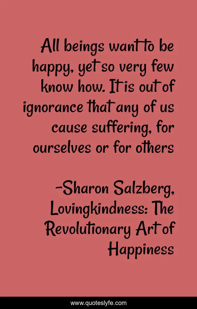 This page presents the quote "All beings want to be happy, yet so very few know how. It is out of ignorance that any of us cause suffering, for ourselves or for others". Author of this quote is Sharon Salzberg, Lovingkindness: The Revolutionary Art of Happiness. This quote is about buddhism, mindfulness, suffering, psychology,.