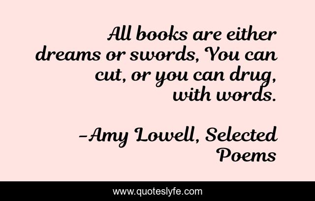 This page presents the quote "All books are either dreams or swords, You can cut, or you can drug, with words.". Author of this quote is Amy Lowell, Selected Poems. This quote is about books, dreams,.