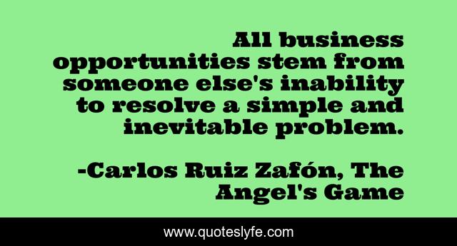 This page presents the quote "All business opportunities stem from someone else's inability to resolve a simple and inevitable problem.". Author of this quote is Carlos Ruiz Zafón, The Angel's Game. .