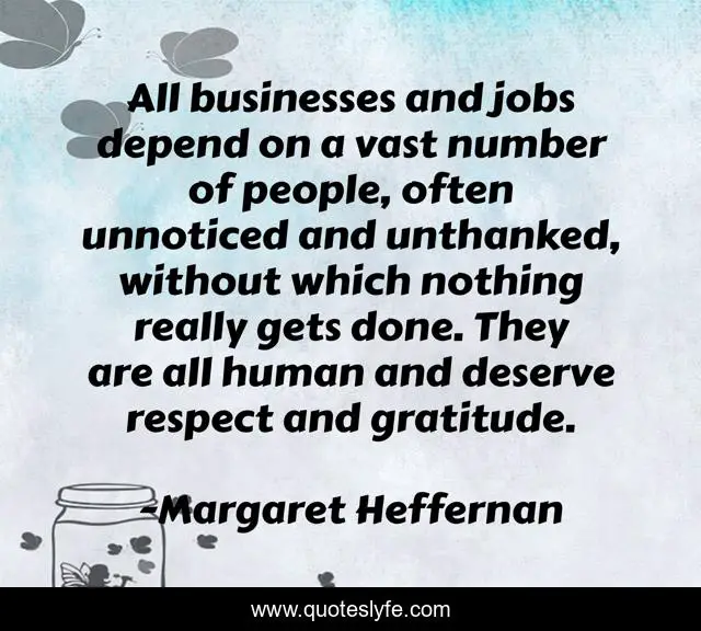 This page presents the quote "All businesses and jobs depend on a vast number of people, often unnoticed and unthanked, without which nothing really gets done. They are all human and deserve respect and gratitude.". Author of this quote is Margaret Heffernan. This quote is about gratitude, human, people,.