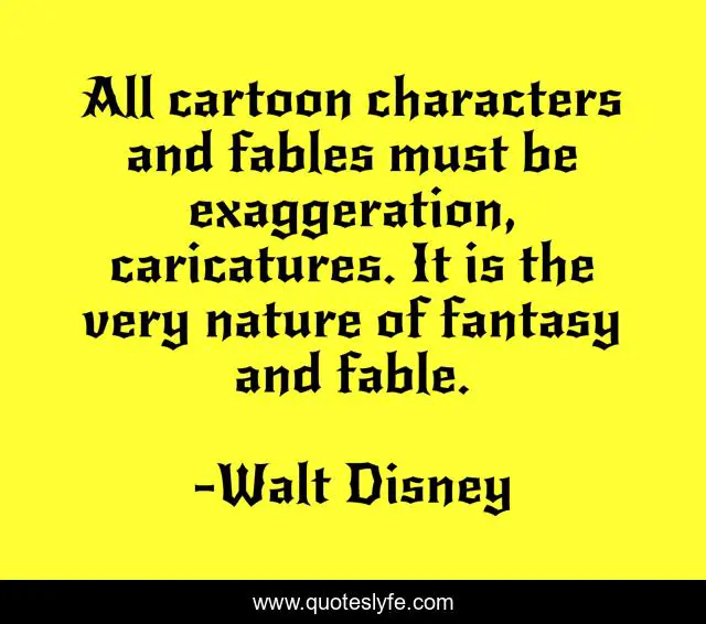 This page presents the quote "All cartoon characters and fables must be exaggeration, caricatures. It is the very nature of fantasy and fable.". Author of this quote is Walt Disney. This quote is about fantasy, cartoon,.