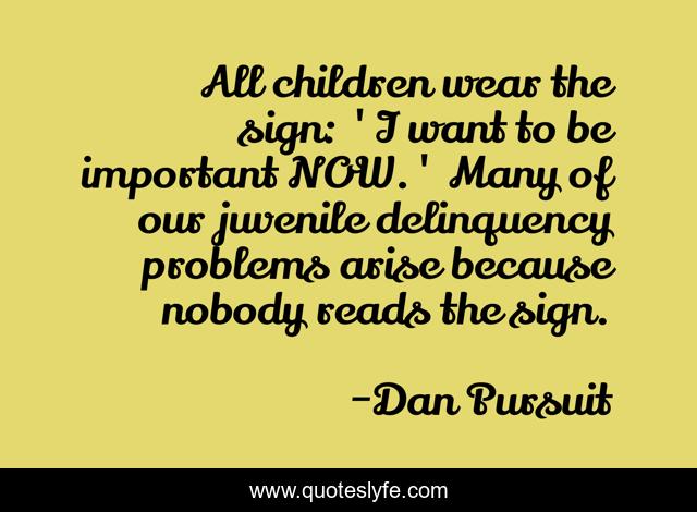 This page presents the quote "All children wear the sign: 'I want to be important NOW.' Many of our juvenile delinquency problems arise because nobody reads the sign.". Author of this quote is Dan Pursuit. This quote is about children, childhood,.
