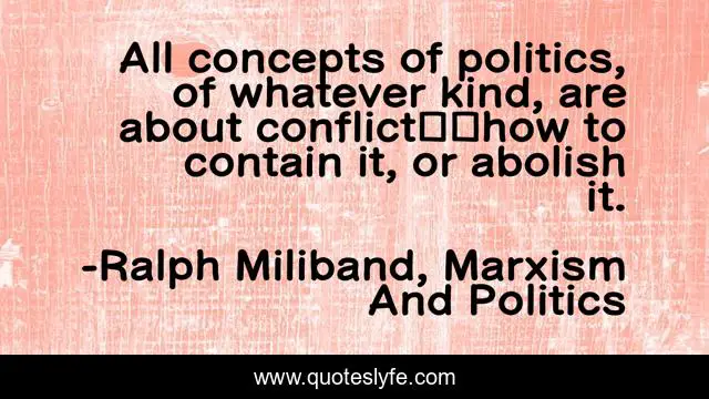 This page presents the quote "All concepts of politics, of whatever kind, are about conflict──how to contain it, or abolish it.". Author of this quote is Ralph Miliband, Marxism And Politics. This quote is about politics, conflict,.