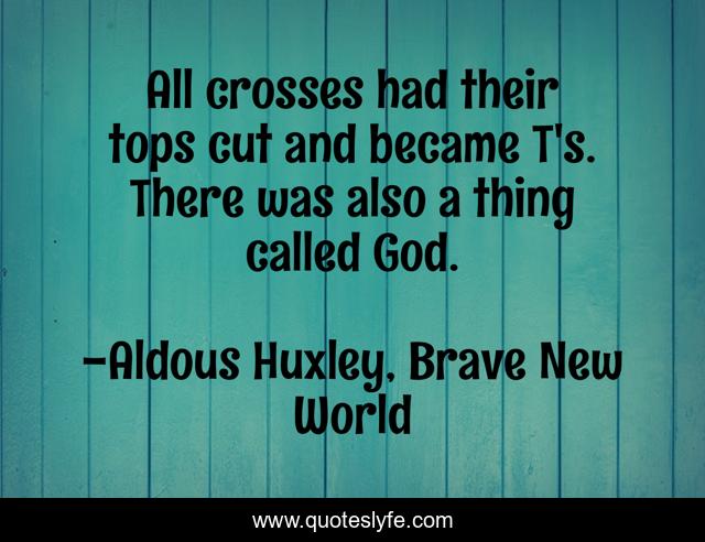 This page presents the quote "All crosses had their tops cut and became T's. There was also a thing called God.". Author of this quote is Aldous Huxley, Brave New World. This quote is about god, letter-t, cross, crosses, t,.