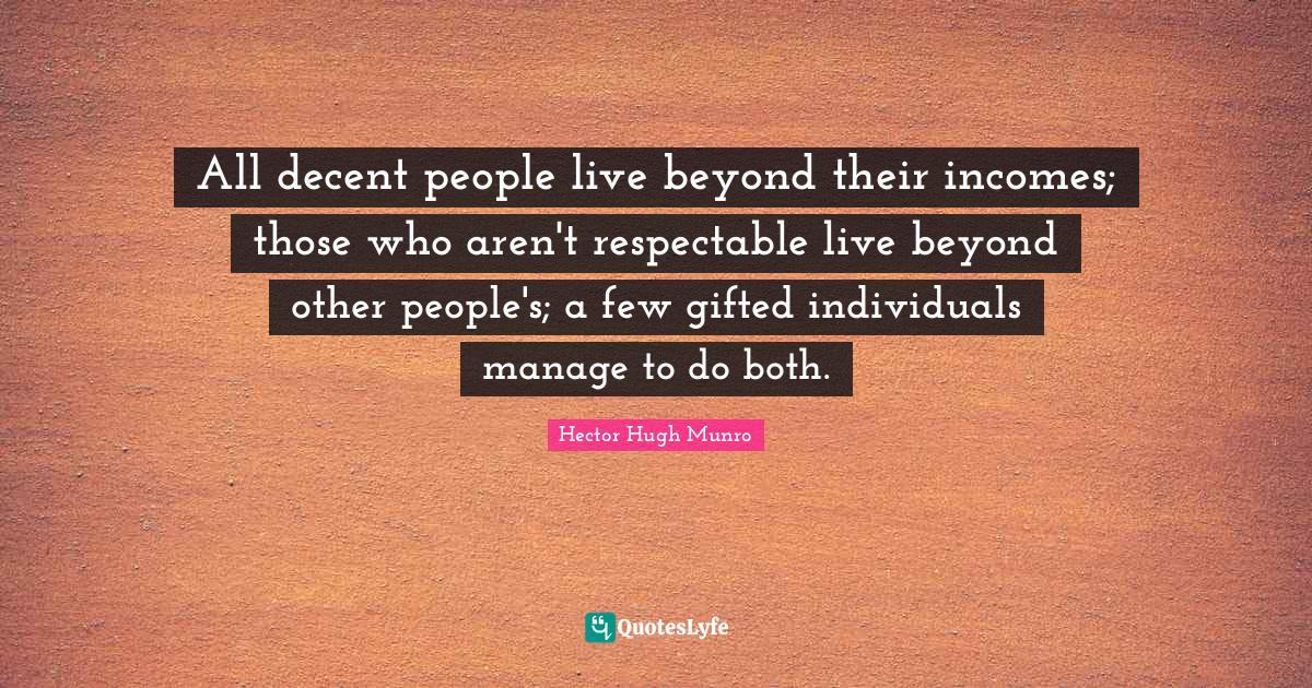 This page presents the quote "All decent people live beyond their incomes; those who aren't respectable live beyond other people's; a few gifted individuals manage to do both.". Author of this quote is Hector Hugh Munro. This quote is about gifted, respectable, income, life, people, decent, manage,.