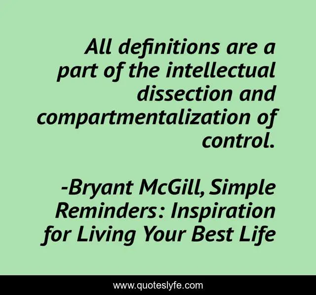 This page presents the quote "All definitions are a part of the intellectual dissection and compartmentalization of control.". Author of this quote is Bryant McGill, Simple Reminders: Inspiration for Living Your Best Life. This quote is about control, definition, dissection, compartmentalization, intellect,.