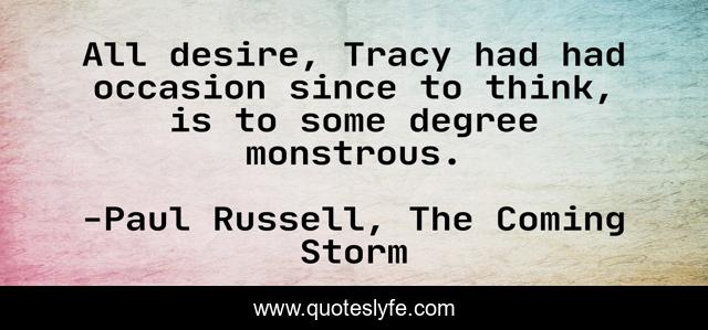 This page presents the quote "All desire, Tracy had had occasion since to think, is to some degree monstrous.". Author of this quote is Paul Russell, The Coming Storm. This quote is about desire, monstrous,.