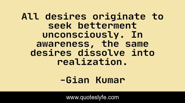 This page presents the quote "All desires originate to seek betterment unconsciously. In awareness, the same desires dissolve into realization.". Author of this quote is Gian Kumar. This quote is about awareness, realization,.