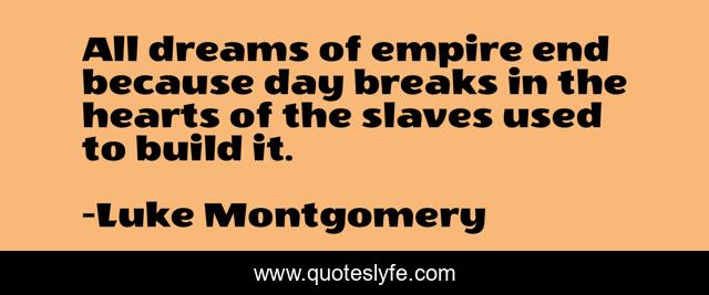 This page presents the quote "All dreams of empire end because day breaks in the hearts of the slaves used to build it.". Author of this quote is Luke Montgomery. This quote is about politics, history,.