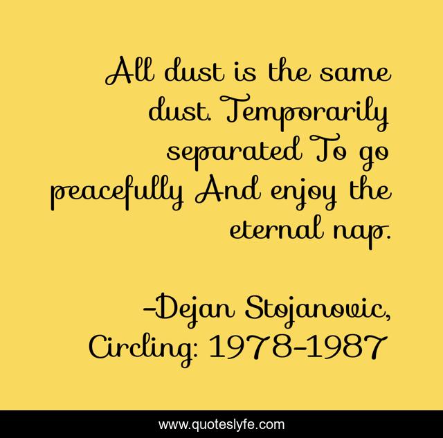 This page presents the quote "All dust is the same dust. Temporarily separated To go peacefully And enjoy the eternal nap.". Author of this quote is Dejan Stojanovic, Circling: 1978-1987. This quote is about literature, dejan-stojanovic, eternal, poetry, wisdom, quotes, nap, circling, separation,.