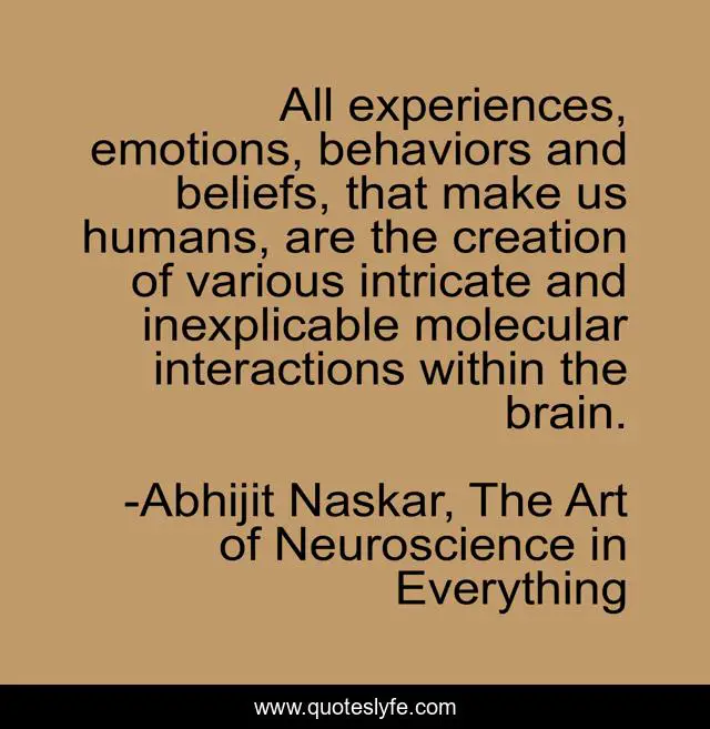This page presents the quote "All experiences, emotions, behaviors and beliefs, that make us humans, are the creation of various intricate and inexplicable molecular interactions within the brain.". Author of this quote is Abhijit Naskar, The Art of Neuroscience in Everything. This quote is about perception, brain, emotions, reality, molecular-biology, beliefs,.