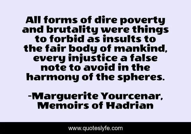 This page presents the quote "All forms of dire poverty and brutality were things to forbid as insults to the fair body of mankind, every injustice a false note to avoid in the harmony of the spheres.". Author of this quote is Marguerite Yourcenar, Memoirs of Hadrian. This quote is about poverty, brutality, injustice,.