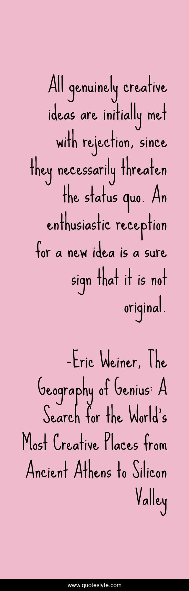 This page presents the quote "All genuinely creative ideas are initially met with rejection, since they necessarily threaten the status quo. An enthusiastic reception for a new idea is a sure sign that it is not original.". Author of this quote is Eric Weiner, The Geography of Genius: A Search for the World's Most Creative Places from Ancient Athens to Silicon Valley. This quote is about originality, creativity, rejection, ideas, status-quo,.