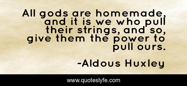 This page presents the quote "All gods are homemade, and it is we who pull their strings, and so, give them the power to pull ours.". Author of this quote is Aldous Huxley. This quote is about gods, homemade, give,.