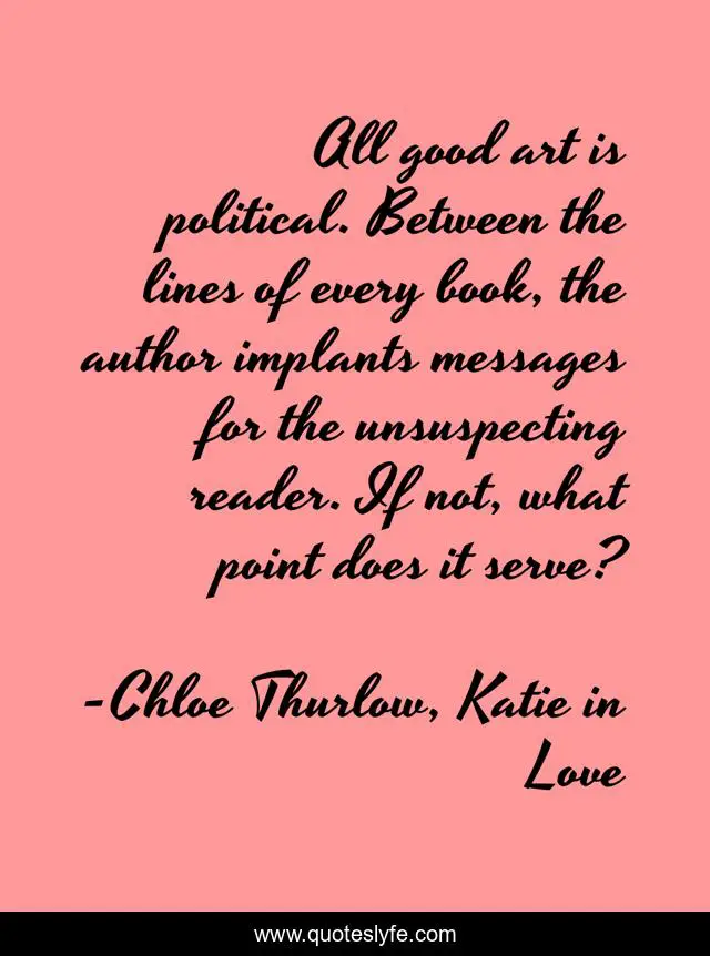 This page presents the quote "All good art is political. Between the lines of every book, the author implants messages for the unsuspecting reader. If not, what point does it serve?". Author of this quote is Chloe Thurlow, Katie in Love. This quote is about art-and-artist, art, art-and-politics,.