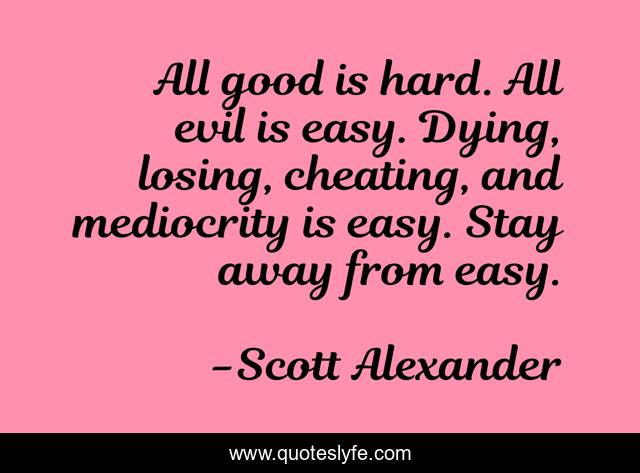 This page presents the quote "All good is hard. All evil is easy. Dying, losing, cheating, and mediocrity is easy. Stay away from easy.". Author of this quote is Scott Alexander. This quote is about losing, evil, easy,.