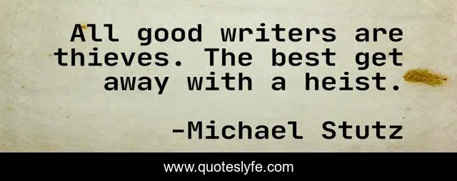 This page presents the quote "All good writers are thieves. The best get away with a heist.". Author of this quote is Michael Stutz. This quote is about literary, writing, writing-life, writing-process,.