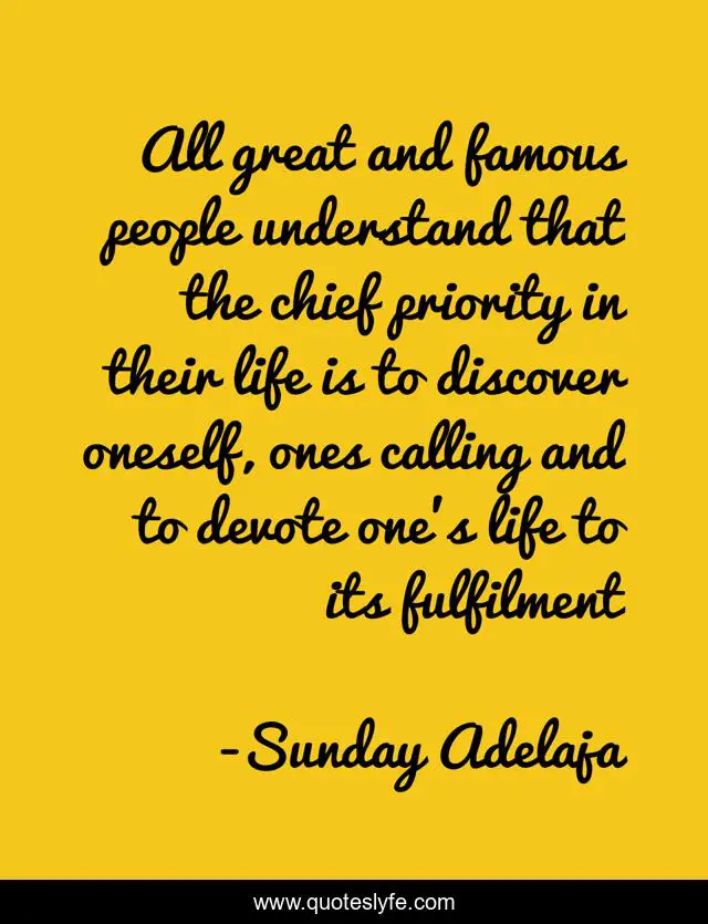 This page presents the quote "All great and famous people understand that the chief priority in their life is to discover oneself, ones calling and to devote one’s life to its fulfilment". Author of this quote is Sunday Adelaja. This quote is about life, people, self-discovery, fulfilment, calling, priority, famous, purpose, fame,.