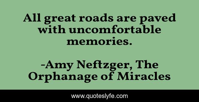 This page presents the quote "All great roads are paved with uncomfortable memories.". Author of this quote is Amy Neftzger, The Orphanage of Miracles. This quote is about memories, greatness, inspirational, memory, roads, enthusiasm,.
