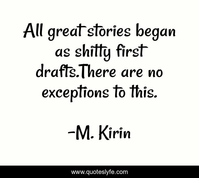 This page presents the quote "All great stories began as shitty first drafts.There are no exceptions to this.". Author of this quote is M. Kirin. This quote is about writer, writer-inspiration, writing-advice, inspiration, writing,.