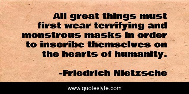 This page presents the quote "All great things must first wear terrifying and monstrous masks in order to inscribe themselves on the hearts of humanity.". Author of this quote is Friedrich Nietzsche. This quote is about philosophy, humanity, history,.