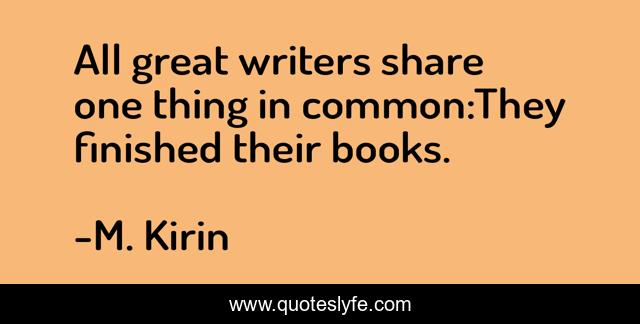 This page presents the quote "All great writers share one thing in common:They finished their books.". Author of this quote is M. Kirin. This quote is about writer, writer-inspiration, writing-advice, inspiration, writing,.