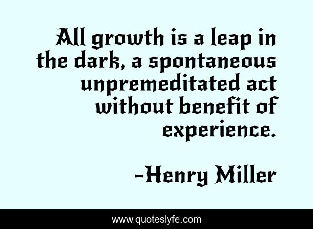 This page presents the quote "All growth is a leap in the dark, a spontaneous unpremeditated act without benefit of experience.". Author of this quote is Henry Miller. This quote is about dark, leap, growth,.