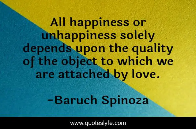 This page presents the quote "All happiness or unhappiness solely depends upon the quality of the object to which we are attached by love.". Author of this quote is Baruch Spinoza. This quote is about love, quality, which, affection,.