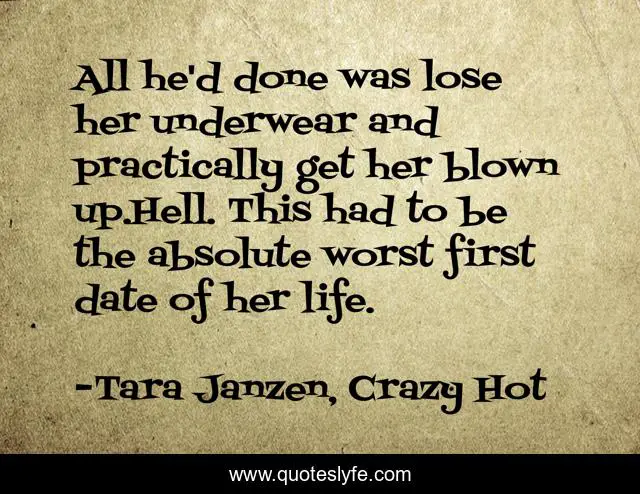 This page presents the quote "All he'd done was lose her underwear and practically get her blown up.Hell. This had to be the absolute worst first date of her life.". Author of this quote is Tara Janzen, Crazy Hot. This quote is about romance, funny, comedy, humour, romantic-suspense,.