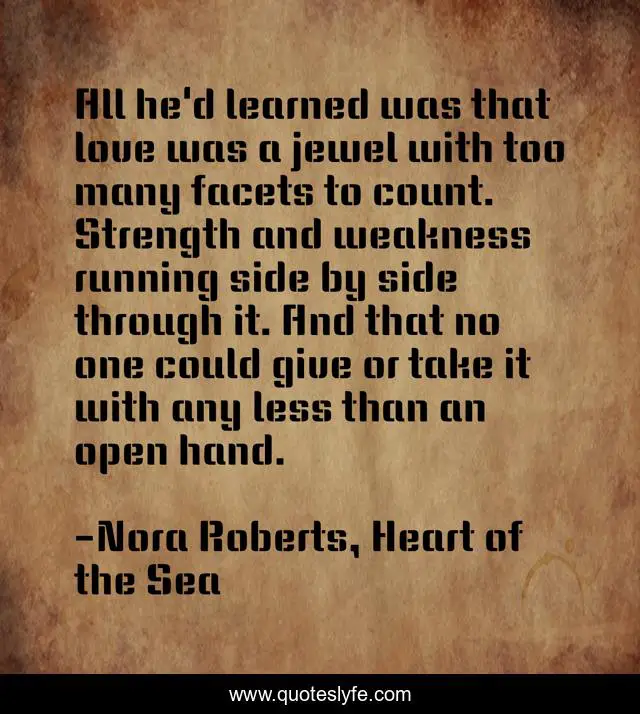 This page presents the quote "All he'd learned was that love was a jewel with too many facets to count. Strength and weakness running side by side through it. And that no one could give or take it with any less than an open hand.". Author of this quote is Nora Roberts, Heart of the Sea. This quote is about weakness, strength, love, affection,.