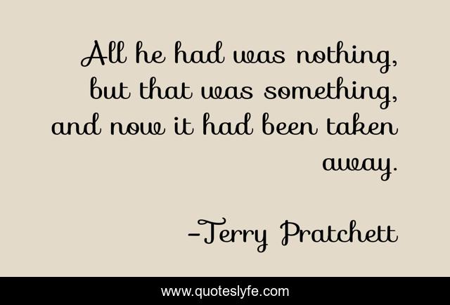 This page presents the quote "All he had was nothing, but that was something, and now it had been taken away.". Author of this quote is Terry Pratchett. This quote is about discworld, nothing, humor, humour,.