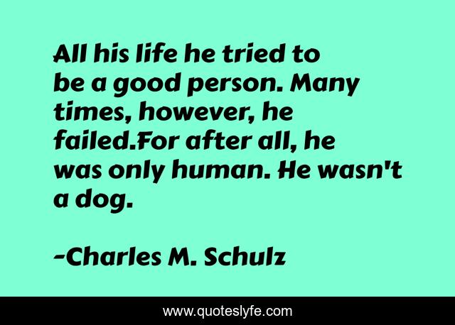 This page presents the quote "All his life he tried to be a good person. Many times, however, he failed.For after all, he was only human. He wasn't a dog.". Author of this quote is Charles M. Schulz. This quote is about animals, humans, dogs,.