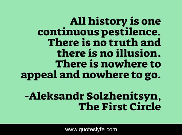 This page presents the quote "All history is one continuous pestilence. There is no truth and there is no illusion. There is nowhere to appeal and nowhere to go.". Author of this quote is Aleksandr Solzhenitsyn, The First Circle. This quote is about post-truth, 1968, ruska-doronin, pessimism, gulag, prison, resignation, history,.