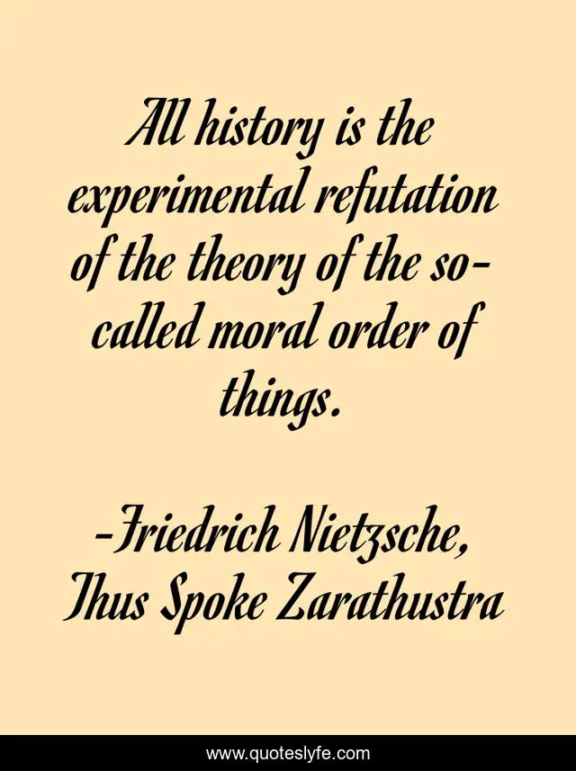 This page presents the quote "All history is the experimental refutation of the theory of the so-called moral order of things.". Author of this quote is Friedrich Nietzsche, Thus Spoke Zarathustra. This quote is about nietzsche, thus-spake-zaruthstra, morality,.