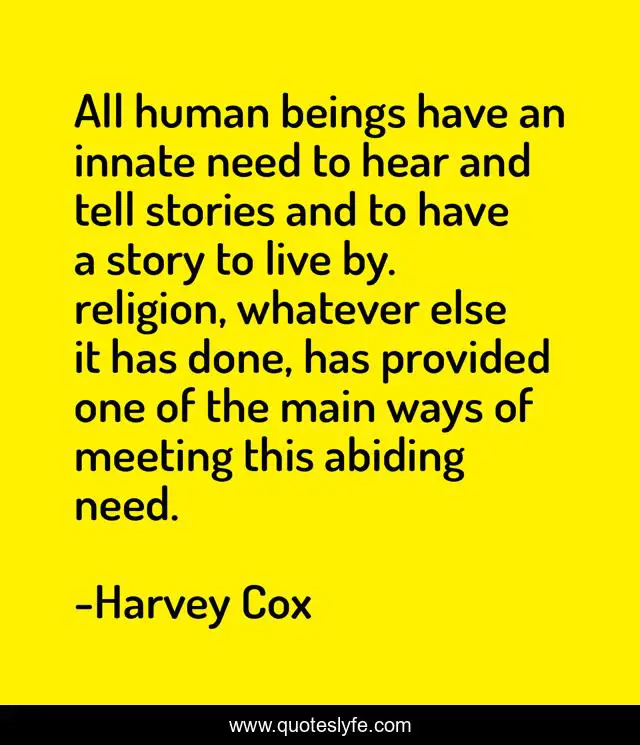 This page presents the quote "All human beings have an innate need to hear and tell stories and to have a story to live by. religion, whatever else it has done, has provided one of the main ways of meeting this abiding need.". Author of this quote is Harvey Cox. This quote is about live, meeting, story,.