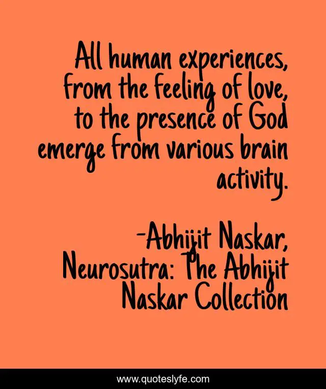 This page presents the quote "All human experiences, from the feeling of love, to the presence of God emerge from various brain activity.". Author of this quote is Abhijit Naskar, Neurosutra: The Abhijit Naskar Collection. This quote is about life, brainy, neurobiology, consciousness, brain, god, mind, human-mind, religion,.