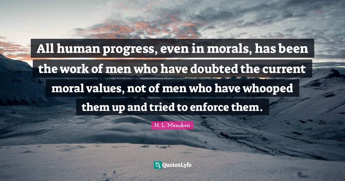 This page presents the quote "All human progress, even in morals, has been the work of men who have doubted the current moral values, not of men who have whooped them up and tried to enforce them.". Author of this quote is H. L. Mencken. This quote is about men, moral values, doubted, society, human progress, work, progress,.