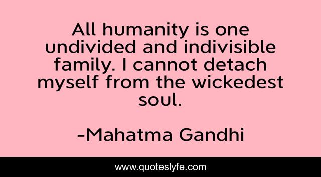 This page presents the quote "All humanity is one undivided and indivisible family. I cannot detach myself from the wickedest soul.". Author of this quote is Mahatma Gandhi. This quote is about mahatma-gandhi, inspiration, inspirational, enthusiasm,.