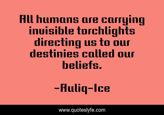 This page presents the quote "All humans are carrying invisible torchlights directing us to our destinies called our beliefs.". Author of this quote is Auliq-Ice. This quote is about encouragement, self-realization, optimistic, happiness, confidence, self-confidence, positive, creativity, positive-thinking,.