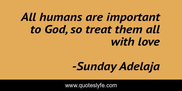 This page presents the quote "All humans are important to God, so treat them all with love". Author of this quote is Sunday Adelaja. This quote is about kingdom, life, love, destiny, serving-god, people, money, god, work,.