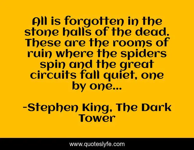 This page presents the quote "All is forgotten in the stone halls of the dead. These are the rooms of ruin where the spiders spin and the great circuits fall quiet, one by one...". Author of this quote is Stephen King, The Dark Tower. .