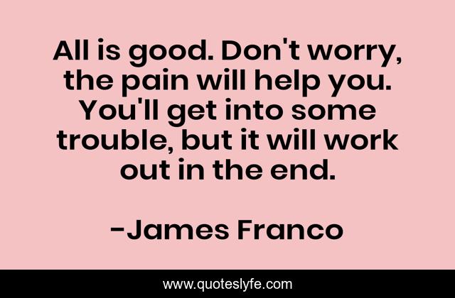 This page presents the quote "All is good. Don't worry, the pain will help you. You'll get into some trouble, but it will work out in the end.". Author of this quote is James Franco. This quote is about enthusiasm, strong, pain, inspirational,.