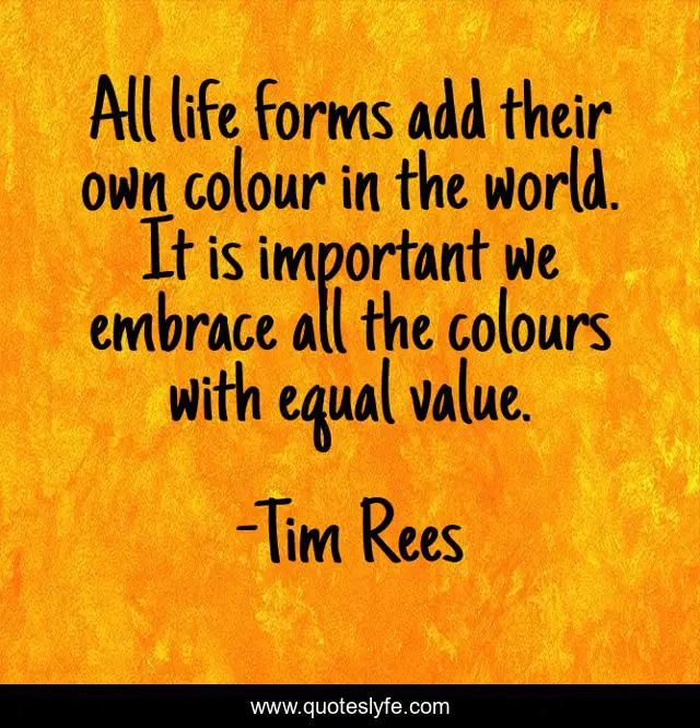 This page presents the quote "All life forms add their own colour in the world. It is important we embrace all the colours with equal value.". Author of this quote is Tim Rees. .