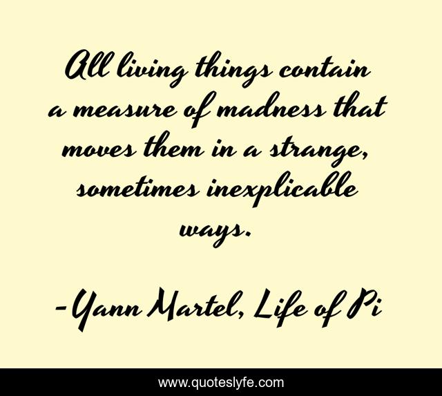 This page presents the quote "All living things contain a measure of madness that moves them in a strange, sometimes inexplicable ways.". Author of this quote is Yann Martel, Life of Pi. This quote is about inexplicable-ways, madness, living-things,.
